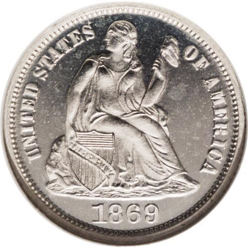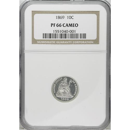 <B>1869 10C PR66 Cameo NGC.</B></I> A gleaming silver-white Premium Gem that has exceptionally deep mirrors and a single spot of haze in the right obverse field. The moderately frosted devices display crisp detail and contribute to the strong cameo effect. Among the best-preserved survivors of the original mintage of 600 specimens. Census: 6 in 66 Cameo, 0 finer (11/06).<BR><BR><b>Shipping:</b> Coin/Currency (<a target="_blank" href="http://www.heritageauctions.com/common/shipping.php">view shipping information</a>)
