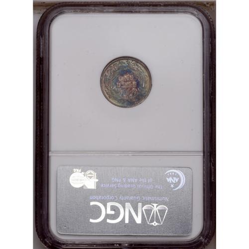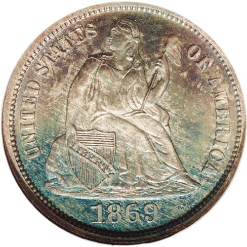 <B>1869<10C> PR66 NGC.</B></I> A bold strike complements the lovely toned surfaces. Both sides have vivid blue, lilac, and iridescent color. Although there is no question that more than one coinage die was used for the production of dimes during the year, there are no unusual varieties reported to date. This is a splendid Gem proof example with exceptional eye appeal. Census: 7 in 66, 6 finer (1/06).