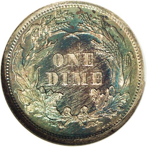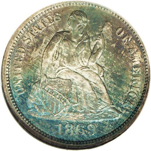 <B>1869<10C> PR66 NGC.</B></I> A bold strike complements the lovely toned surfaces. Both sides have vivid blue, lilac, and iridescent color. Although there is no question that more than one coinage die was used for the production of dimes during the year, there are no unusual varieties reported to date. This is a splendid Gem proof example with exceptional eye appeal. Census: 7 in 66, 6 finer (4/06).