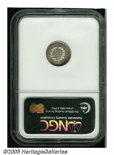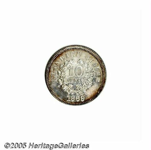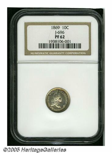 <B>1869<10C> Standard Silver Ten Cents, Judd-696, Pollock-775, R.5, PR62 NGC.</B></I> Standard Silver design, the head of Liberty is crowned with three large stars and the motto in beneath the bust. The reverse has 10 CENTS in the center, surrounded by a thick wreath of oak and laurel, at the upper periphery is STANDARD SILVER with the date below. Struck in silver with a reeded edge. Honey-gold color graces the borders of this crisply struck and nicely mirrored pattern. The fields have faint hairlines, and a couple of drops of lacquer are noted at 8 o'clock on the reverse.