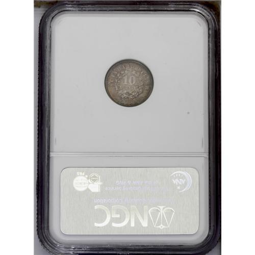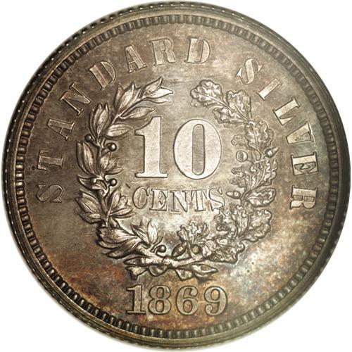 <B>1869<10C> Standard Silver Ten Cents, Judd-696, Pollock-775, R.5, PR65 NGC.</B></I> Liberty is adorned with three large stars, and the motto is displayed in a banner beneath the bust. The reverse has 10 CENTS in the center, surrounded by a thick wreath of oak and laurel. STANDARD SILVER is across the upper reverse border, and the date fills the exergue. Pinpoint striking details are seen on each side of this essentially flawless Gem. Medium gray and golden-rose toning evenly covers each side. <BR><BR><B>Important notice:</B> Heritage usually auctions material at the rate of 200-250 lots per hour. On some occasions eBay Live bid software or the Internet may not be able to keep up with the pace of the auction. We recommend placing a realistic absentee bid now as insurance to avoid disappointment. Occasionally the auctioneer may eliminate or reject an eBay Live bid, and the auctioneer may also reopen a lot after the close of the eBay live bidding (usually because we missed an audience bid), and may reject your bid even if it shows you as the winning bidder. By bidding via eBay Live, you agree that Heritage may award the lot to another bidder at its sole discretion under the circumstances described above or any other reasonable circumstances. Since eBay bids are not shown to us until we open the lot on the floor, we treat those bids just like floor bids. In most cases the floor responds before the eBay bid is presented to us, due to Internet lag time, so for consistency we have made it a policy that floor bids are always considered first over tie eBay live bids. Also please note that all Heritage lots purchased through eBay Live carry a 20% Buyer's Premium. Please make sure you read the Terms and Conditions before you bid. This lot is being auctioned in conjunction with a live floor auction by Heritage Galleries & Auctioneers. All final auction and invoice information will be supplied by Heritage Galleries & Auctioneers, and all other information should be considered preliminary. Lot:1837 <BR><BR><B>Winning Notification and Billing:</B> After the FINAL session in this auction is complete, Heritage will send e-mail and snail mail invoices. This process normally takes several days. All final auction and invoice information will be supplied by Heritage Galleries & Auctioneers, and all other information should be considered preliminary. <BR><BR>This auction will be conducted on a live auction floor and over the Internet through eBay Live. If you choose to place an absentee bid, please take a moment to <font color='#0000ff'><u><a href='http://pages.ebay.com/liveauctions/help/before/laabsentee.html'>learn how eBay Live absentee bidding works</a></u></font><font color='#000000'>
