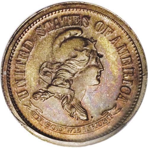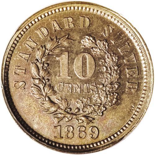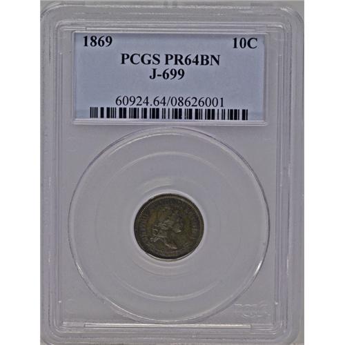 <B>1869<10C> Standard Silver Ten Cents, Judd-699, Pollock-778, High R.7, PR64 Brown PCGS.</B></I> Standard Silver design, the head of Liberty is crowned with three large stars and the motto in beneath the bust. The reverse has 10 CENTS in the center, surrounded by a thick wreath of oak and laurel, at the upper periphery is STANDARD SILVER with the date below. Struck in copper with a plain edge. Attractive medium brown patina with pronounced reddish accents in selected protected areas. One dark spot is mentioned at the top of Liberty's nose for pedigree purposes. Population: 2 in 64, 0 finer (7/06).