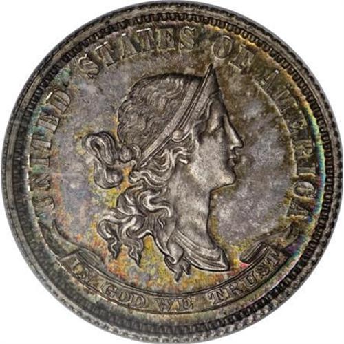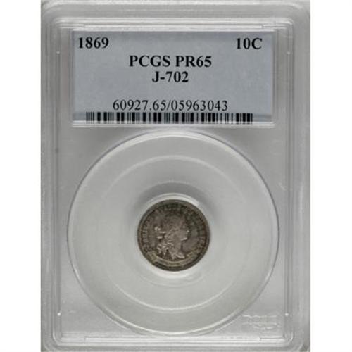 <B>1869 10C Standard Silver Ten Cents, Judd-702, Pollock-781, R.5, PR65 PCGS.</B></I> Liberty faces right, wearing a diadem, her hair tied in a bun. Around, UNITED STATES OF AMERICA, and below, a scroll with the motto IN GOD WE TRUST. On the reverse, a wreath of oak and laurel encloses the denomination 10 CENTS with STANDARD SILVER around and the date below. Struck in silver with a reeded edge. A fairly common Standard Silver pattern, this piece has nicely reflective fields and each side is covered with speckled, multicolored iridescent toning.<BR><BR><b>Shipping:</b> Coins & Currency (<a target="_blank" href="http://www.heritageauctions.com/common/shipping.php">view shipping information</a>)
