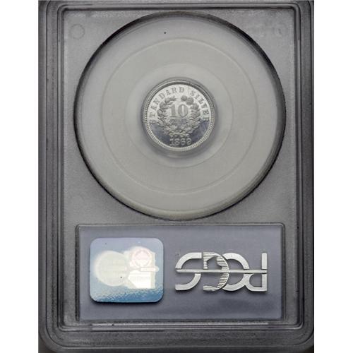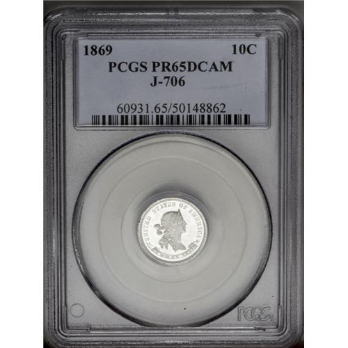 <B>1869<10C> Standard Silver Ten Cents, Judd-706, Pollock-785, Low R.7, PR65 Deep Cameo PCGS.</B></I> Standard Silver design with the head of Liberty facing right with a diadem in her hair, motto below, and UNITED STATES OF AMERICA above. The reverse has 10 CENTS in the center, surrounded by a wreath of oak and laurel, with STANDARD SILVER 1869 around the margin. Struck in aluminum with a reeded edge. Both sides are untoned with light die striations in the fields and only a couple of specks of oxidation to the left of the S in SILVER. Sharply contrasted and extraordinarily well preserved for this elusive Standard Silver issue. <BR><BR><B>Important notice:</B> Heritage usually auctions material at the rate of 200-250 lots per hour. On some occasions eBay Live bid software or the Internet may not be able to keep up with the pace of the auction. We recommend placing a realistic absentee bid now as insurance to avoid disappointment. Occasionally the auctioneer may eliminate or reject an eBay Live bid, and the auctioneer may also reopen a lot after the close of the eBay live bidding (usually because we missed an audience bid), and may reject your bid even if it shows you as the winning bidder. By bidding via eBay Live, you agree that Heritage may award the lot to another bidder at its sole discretion under the circumstances described above or any other reasonable circumstances. Since eBay bids are not shown to us until we open the lot on the floor, we treat those bids just like floor bids. In most cases the floor responds before the eBay bid is presented to us, due to Internet lag time, so for consistency we have made it a policy that floor bids are always considered first over tie eBay live bids. Also please note that all Heritage lots purchased through eBay Live carry a 20% Buyer's Premium. Please make sure you read the Terms and Conditions before you bid. This lot is being auctioned in conjunction with a live floor auction by Heritage Galleries & Auctioneers. All final auction and invoice information will be supplied by Heritage Galleries & Auctioneers, and all other information should be considered preliminary. Lot:1838 <BR><BR><B>Winning Notification and Billing:</B> After the FINAL session in this auction is complete, Heritage will send e-mail and snail mail invoices. This process normally takes several days. All final auction and invoice information will be supplied by Heritage Galleries & Auctioneers, and all other information should be considered preliminary. <BR><BR>This auction will be conducted on a live auction floor and over the Internet through eBay Live. If you choose to place an absentee bid, please take a moment to <font color='#0000ff'><u><a href='http://pages.ebay.com/liveauctions/help/before/laabsentee.html'>learn how eBay Live absentee bidding works</a></u></font><font color='#000000'>