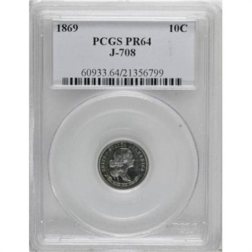 <B>1869 10C Standard Silver Ten Cents, Judd-708, Pollock-787, R.5, PR64 PCGS.</B></I> Liberty faces right and wears a band ornamented with a star. IN GOD WE TRUST is placed on a banner beneath the bust. On the reverse, an undersized wreath crowds the 10/CENTS denomination. The reverse periphery displays STANDARD SILVER and the date. Struck in silver with a reeded edge. An attractive example of this fairly common Standard Silver pattern. Both sides are enveloped with deep blue toning that shows a significant amount of rose color in the centers.<BR><BR><b>Shipping:</b> Coins & Currency (<a target="_blank" href="http://www.heritageauctions.com/common/shipping.php">view shipping information</a>)