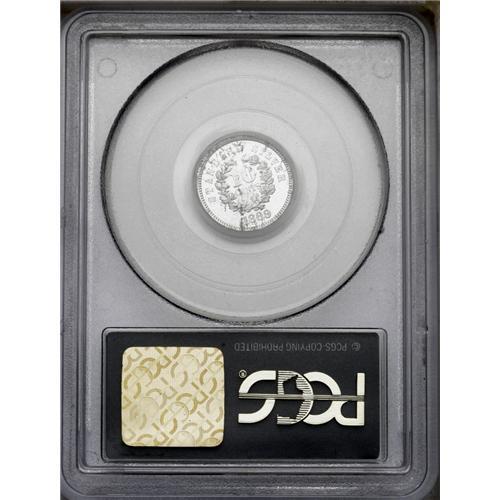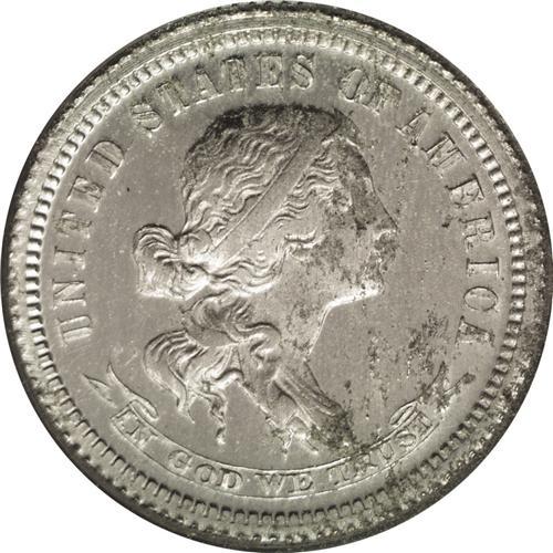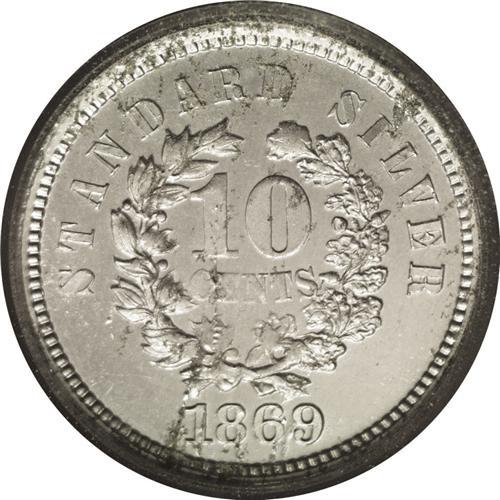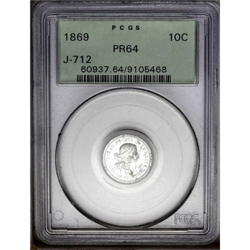 <B>1869<10C> Standard Silver Ten Cents, Judd-712, Pollock-791, High R.7, PR64 PCGS.</B></I> Liberty faces right and wears a headband ornamented with a star. The reverse features an oak and laurel wreath with STANDARD SILVER above and the date below. Struck in aluminum with a reeded edge. USPatterns.com states that "less than a half dozen are known" of this issue, and this one is tied with one other as the finest seen by NGC or PCGS. Traces of verdigris on the obverse and reverse. Housed in an older green insert PCGS holder. <BR><BR><B>Important notice:</B> Heritage usually auctions material at the rate of 200-250 lots per hour. On some occasions eBay Live bid software or the Internet may not be able to keep up with the pace of the auction. We recommend placing a realistic absentee bid now as insurance to avoid disappointment. Occasionally the auctioneer may eliminate or reject an eBay Live bid, and the auctioneer may also reopen a lot after the close of the eBay live bidding (usually because we missed an audience bid), and may reject your bid even if it shows you as the winning bidder. By bidding via eBay Live, you agree that Heritage may award the lot to another bidder at its sole discretion under the circumstances described above or any other reasonable circumstances. Since eBay bids are not shown to us until we open the lot on the floor, we treat those bids just like floor bids. In most cases the floor responds before the eBay bid is presented to us, due to Internet lag time, so for consistency we have made it a policy that floor bids are always considered first over tie eBay live bids. Also please note that all Heritage lots purchased through eBay Live carry a 20% Buyer's Premium. Please make sure you read the Terms and Conditions before you bid. This lot is being auctioned in conjunction with a live floor auction by Heritage Galleries & Auctioneers. All final auction and invoice information will be supplied by Heritage Galleries & Auctioneers, and all other information should be considered preliminary. Lot:1839 <BR><BR><B>Winning Notification and Billing:</B> After the FINAL session in this auction is complete, Heritage will send e-mail and snail mail invoices. This process normally takes several days. All final auction and invoice information will be supplied by Heritage Galleries & Auctioneers, and all other information should be considered preliminary. <BR><BR>This auction will be conducted on a live auction floor and over the Internet through eBay Live. If you choose to place an absentee bid, please take a moment to <font color='#0000ff'><u><a href='http://pages.ebay.com/liveauctions/help/before/laabsentee.html'>learn how eBay Live absentee bidding works</a></u></font><font color='#000000'>