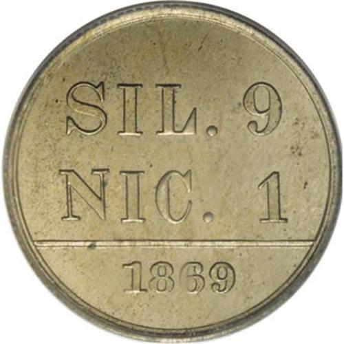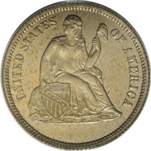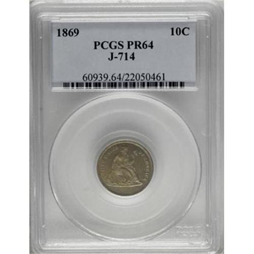 <B>1869 10C Ten Cents, Judd-714, Pollock-793, Low R.7, PR64 PCGS.</B></I> The obverse features the regular issue Liberty Seated design without the date. The reverse is inscribed SIL. 9 NIC. 1 and the date, 1869 below a solid line. Struck in nickel composition with a reeded edge. According to David Cassel, who has made an extensive study of Postage Currency and related patterns, the silver-nickel alloy as it is stated on the reverse of this pattern are incompatible metals and do not alloy. SEM-EDX testing on several Judd-714 pieces has shown them to be struck in the standard 75% copper, 25% nickel alloy in use at the time. Cassel attributes these pieces as Judd-715a. Pale champagne toning over pewter-gray surfaces. Very sharply struck and yet only slightly reflective.<BR><BR><BR><b>Shipping:</b> Coins & Currency (<a target="_blank" href="http://www.heritageauctions.com/common/shipping.php">view shipping information</a>)