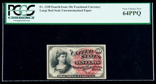 1869, 10¢ Fractional Currency. Fourth Issue, large red seal, unwatermarked paper. PCGS Very Choice New 64PPQ. . Fr-1258. The margins on this Fractional 10¢ note come very close to reaching the Gem category. Well centered and boldly colored.