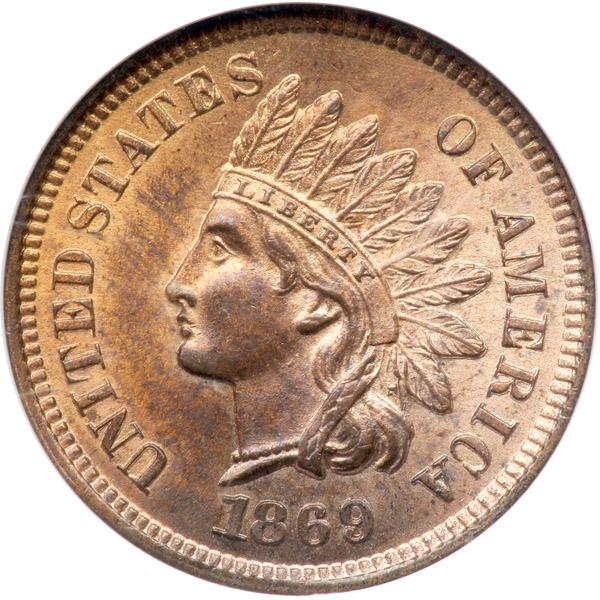 1869/1869 FS-008.3. NGC graded MS-66 Red & Brown. Accompanied by an Eagle Eye certificate. Lots of mint red. A superlative gem in every respect. The luster is never ending, the coppery and gold highlights vie with each other for dominance, while the strike is essentially as sharp as you will ever find for the 1869 issue. Regarding this date, the clearest details are found throughout the feather areas and also encompassing the key wreath and shield which are crystal clear as noted in their finest design features.