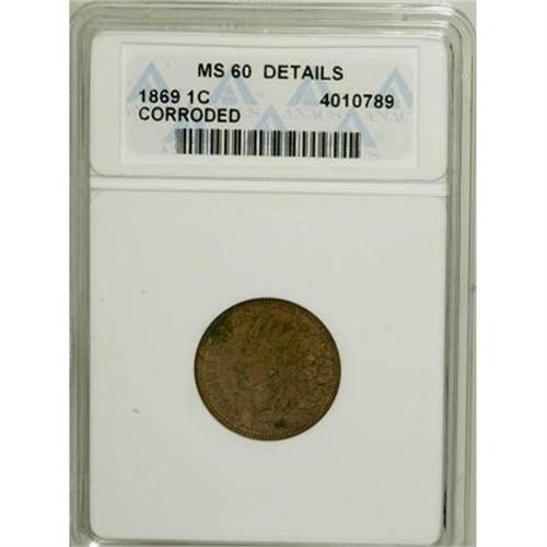 <B>1869 1C --Corroded--ANACS.</B></I> <B>MS60 Details</B></I>. NGC Census: (0/175). PCGS Population (2/117). Mintage: 6,420,000. Numismedia Wsl. Price for NGC/PCGS coin in MS60: $429. (#2094)<BR><BR><B>Coin Engraver:</B> James B. Longacre<BR><BR><b>Shipping:</b> Coins & Currency (<a target="_blank" href="http://www.heritageauctions.com/common/shipping.php">view shipping information</a>)