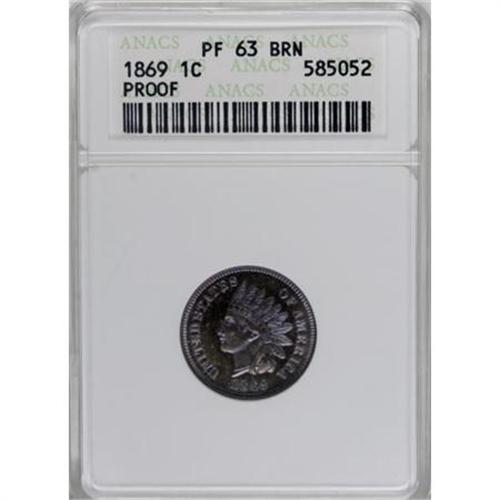 <B>1869 1C PR63 Brown ANACS.</B></I> NGC Census: (4/15). PCGS Population (8/11). Mintage: 600. Numismedia Wsl. Price for NGC/PCGS coin in PR63: $375. (#2294)<BR><BR><B>Coin Engraver:</B> James B. Longacre<BR><BR><b>Shipping:</b> Coins & Currency (<a target="_blank" href="http://www.heritageauctions.com/common/shipping.php">view shipping information</a>)