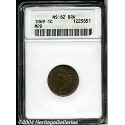 <B>1869<1C> MS62 Brown ANACS.</B></I> RPD-001,R.6. An exceptionally scarce repunched date, the 6 and 9 from 1869 are traceable in the denticles of this Indian cent. The surfaces of this piece show a light green and orange patina atop lightly abraded surfaces. Several carbon specks keep the coin from a loftier grade. <BR><BR><B>Important notice:</B> Heritage usually auctions material at the rate of 200-250 lots per hour. On some occasions eBay Live bid software or the Internet may not be able to keep up with the pace of the auction. We recommend placing a realistic absentee bid now as insurance to avoid disappointment. Occasionally the auctioneer may eliminate or reject an eBay Live bid, and the auctioneer may also reopen a lot after the close of the eBay live bidding (usually because we missed an audience bid), and may reject your bid even if it shows you as the winning bidder. By bidding via eBay Live, you agree that Heritage may award the lot to another bidder at its sole discretion under the circumstances described above or any other reasonable circumstances. Since eBay bids are not shown to us until we open the lot on the floor, we treat those bids just like floor bids. In most cases the floor responds before the eBay bid is presented to us, due to Internet lag time, so for consistency we have made it a policy that floor bids are always considered first over tie eBay live bids. Also please note that all Heritage lots purchased through eBay Live carry a 20% Buyer's Premium. Please make sure you read the Terms and Conditions before you bid. </span></font></tr></table></td></tr></table>
