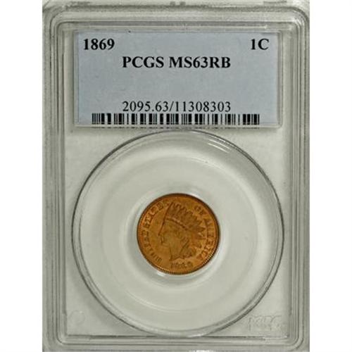 <B>1869 1C MS63 Red and Brown PCGS.</B></I> The vibrant reddish-orange surfaces of this Select post-war piece mellow slightly at the center of the obverse. An attractive example kept from a finer grade by faint abrasions on and around the well-defined portrait.<BR><BR><B>Coin Engraver:</B> James B. Longacre<BR><BR><b>Shipping:</b> Coins & Currency (<a target="_blank" href="http://www.heritageauctions.com/common/shipping.php">view shipping information</a>)