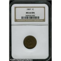 <B>1869 1C MS64 Brown NGC.</B></I> Light brown patination, with orange accents, mostly in the protected areas. The design elements are well struck, and there are no significant marks apparent. Lot:5213