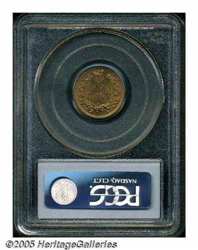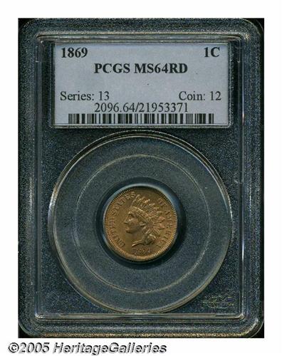 <B>1869<1C> MS64 Red PCGS.</B></I> Full red color throughout, the coin is only held back from a higher grade by the presence of some tiny flyspecks on the obverse. Sharply struck, lustrous, and minimally marked, with faint die clash marks (as struck) evident on each side of the coin. Very scarce with original red color from such an early date. Population: 40 in 64 Red, 35 finer (4/05).