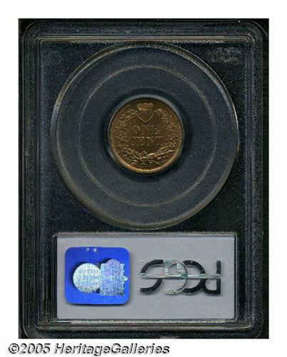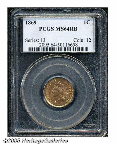 <B>1869<1C> MS64 Red and Brown PCGS. Eagle Eye Photo Seal, card included.</B></I> Snow-3e. Very close to full Red, this lovely and unmarked honey-gold near-Gem has faint lime and cherry-red overtones on the obverse center. The 69 in the date is repunched north, and curious die defects are noted on the shield and the O in ONE.