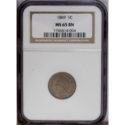 <B>1869<1C> MS65 Brown NGC.</B></I> Tan patination displays subtle orange-gold undertones. The design elements are sharply impressed, including clarity on all four diamonds and on most of the feather tips. A miniscule mark on the Indian's forehead is mentioned for accuracy. Census: 28 in 65, 5 finer (3/06). <BR><BR><B>Important notice:</B> Heritage usually auctions material at the rate of 200-250 lots per hour. On some occasions eBay Live bid software or the Internet may not be able to keep up with the pace of the auction. We recommend placing a realistic absentee bid now as insurance to avoid disappointment. Occasionally the auctioneer may eliminate or reject an eBay Live bid, and the auctioneer may also reopen a lot after the close of the eBay live bidding (usually because we missed an audience bid), and may reject your bid even if it shows you as the winning bidder. By bidding via eBay Live, you agree that Heritage may award the lot to another bidder at its sole discretion under the circumstances described above or any other reasonable circumstances. Since eBay bids are not shown to us until we open the lot on the floor, we treat those bids just like floor bids. In most cases the floor responds before the eBay bid is presented to us, due to Internet lag time, so for consistency we have made it a policy that floor bids are always considered first over tie eBay live bids. Also please note that all Heritage lots purchased through eBay Live carry a 20% Buyer's Premium. Please make sure you read the Terms and Conditions before you bid. This lot is being auctioned in conjunction with a live floor auction by Heritage Galleries & Auctioneers. All final auction and invoice information will be supplied by Heritage Galleries & Auctioneers, and all other information should be considered preliminary. Lot:381 <BR><BR><B>Winning Notification and Billing:</B> After the FINAL session in this auction is complete, Heritage will send e-mail and snail mail invoices. This process normally takes several days. All final auction and invoice information will be supplied by Heritage Galleries & Auctioneers, and all other information should be considered preliminary. <BR><BR>This auction will be conducted on a live auction floor and over the Internet through eBay Live. If you choose to place an absentee bid, please take a moment to <font color='#0000ff'><u><a href='http://pages.ebay.com/liveauctions/help/before/laabsentee.html'>learn how eBay Live absentee bidding works</a></u></font><font color='#000000'>