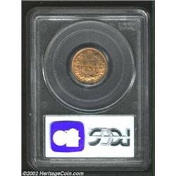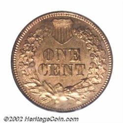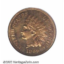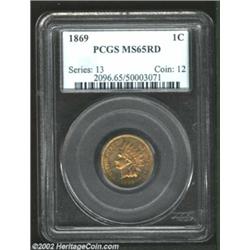 1869 1C MS65 Red PCGS. Snow-4. Slight repunching is evident above the bottom of the 9, called "very scarce" in the Snow reference. The 1869 is another scarce early issue in Gem condition and with full red color, even though 6.4 million pieces were produced. Bright orange-red color overall with a shimmering, semi-prooflike obverse field. Fully struck and an immaculate example of this popular and widely collected date. Population: 25 in 65, 6 finer (9/02). Important notice: We expect to be auctioning lots at the rate of 200-250 per hour. Sometimes eBay Premier live bid software cannot keep up with that pace, so we strongly recommend that you place a realistic proxy bid now as insurance to avoid disappointment. Also please note that all Heritage/CAA lots purchased through eBay Premier carry a 20% Buyer's Premium. Please make sure you read the Terms and Conditions.