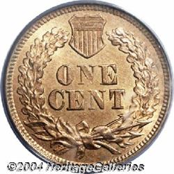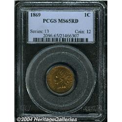 <B>1869<1C> MS65 Red PCGS.</B></I> FS-8.3, Snow-3c. The 69 in the date is repunched south. Once believed to be an 1869/8, and actually listed as such in Breen's Encyclopedia and earlier editions of <I>Cherrypickers'.</B></I> This bold repunched date variety has nonetheless retained its separate <I>Guide Book</B></I> listing. A well struck Gem with booming luster and splendid copper-red color. Exquisitely preserved, as only an infrequent miniscule carbon fleck precludes perfection. Population: 27 in 65 Red, 7 finer (9/04). <BR><BR><B>Important notice:</B> Heritage usually auctions material at the rate of 200-250 lots per hour. On some occasions eBay Live bid software or the Internet may not be able to keep up with the pace of the auction. We recommend placing a realistic absentee bid now as insurance to avoid disappointment. Occasionally the auctioneer may eliminate or reject an eBay Live bid, and the auctioneer may also reopen a lot after the close of the eBay live bidding (usually because we missed an audience bid), and may reject your bid even if it shows you as the winning bidder. By bidding via eBay Live, you agree that Heritage may award the lot to another bidder at its sole discretion under the circumstances described above or any other reasonable circumstances. Since eBay bids are not shown to us until we open the lot on the floor, we treat those bids just like floor bids. In most cases the floor responds before the eBay bid is presented to us, due to Internet lag time, so for consistency we have made it a policy that floor bids are always considered first over tie eBay live bids. Also please note that all Heritage lots purchased through eBay Live carry a 20% Buyer's Premium. Please make sure you read the Terms and Conditions before you bid.