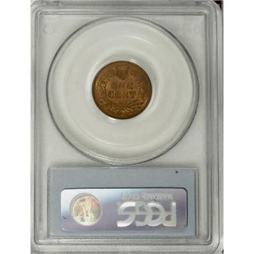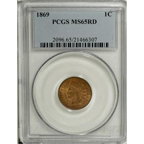<B>1869 1C MS65 Red PCGS.</B></I> FS-8.3, Snow-3c. The 69 in the date is repunched south. Once believed to be an 1869/8, and actually listed as such in Breen's <I>Encyclopedia</B></I> and earlier editions of <I>The Cherrypickers' Guide.</B></I> This bold repunched date variety maintains a separate <I>Guide Book</B></I> listing. This is a well struck Gem with booming luster and splendid copper-red color. Exquisitely preserved, as only the occasional small carbon fleck precludes perfection. Population: 29 in 65, 7 finer (7/07).<BR><I>From The Santa Fe Collection.</B></I><BR><BR><B>Coin Engraver:</B> James B. Longacre<BR><BR><b>Shipping:</b> Coins & Currency (<a target="_blank" href="http://www.heritageauctions.com/common/shipping.php">view shipping information</a>\)