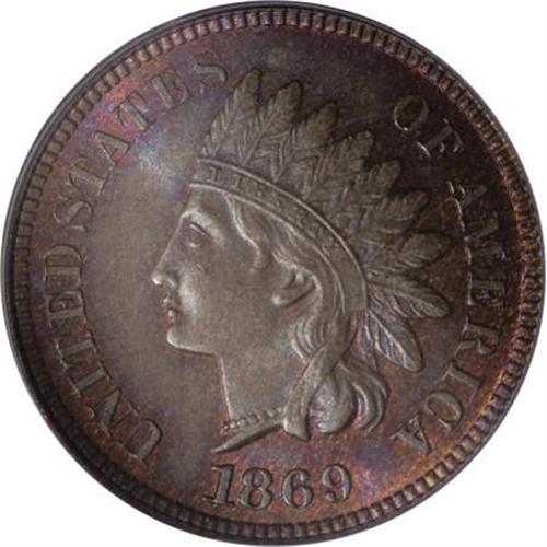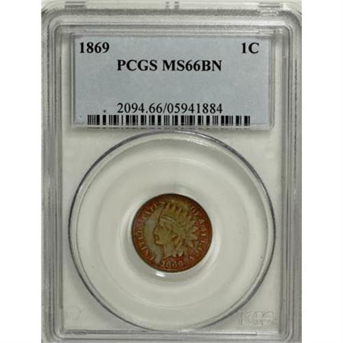 <B>1869 1C MS66 Brown PCGS.</B></I> This coin has a surprise waiting for anyone who views it: how much red is present on a coin that has been certified as Brown. Deep cherry-red outlines the margin on each side and the devices on the reverse. Otherwise, steel-gray and brown color is seen over the remainder of the glossy surfaces. Fully struck. Population: 3 in 66, 0 finer (8/07).<BR><BR><B>Coin Engraver:</B> James B. Longacre<BR><BR><b>Shipping:</b> Coins & Currency (<a target="_blank" href="http://www.heritageauctions.com/common/shipping.php">view shipping information</a>)