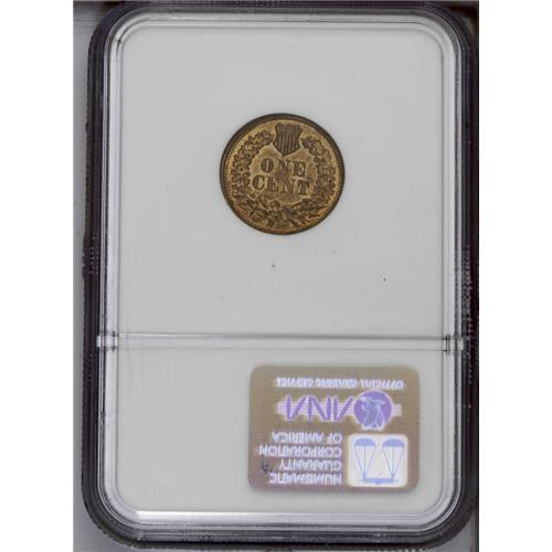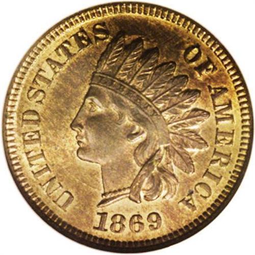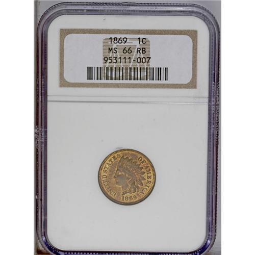 <B>1869<1C> MS66 Red and Brown NGC.</B></I> A popular early Indian cent and a challenging one as well with any amount of original red remaining. This piece shows perhaps half of the original orange-red mint luster with the remainder of the coin faded red that has now mostly turned brown. Sharply struck throughout with heavy die striations on the reverse. Die clashed and showing several peripheral die cracks on the obverse. Census: 30 in 66, 0 finer (8/06).