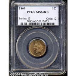 <B>1869<1C> MS66 Red and Brown PCGS.</B></I> Essentially mark-free and well struck, this piece shows large amounts of the original red color and little of the dark brown color that is frequently seen on Red and Brown coins. <BR><BR><B>Important notice:</B> Heritage usually auctions material at the rate of 200-250 lots per hour. On some occasions eBay Live bid software or the Internet may not be able to keep up with the pace of the auction. We recommend placing a realistic absentee bid now as insurance to avoid disappointment. Occasionally the auctioneer may eliminate or reject an eBay Live bid, and the auctioneer may also reopen a lot after the close of the eBay live bidding (usually because we missed an audience bid), and may reject your bid even if it shows you as the winning bidder. By bidding via eBay Live, you agree that Heritage may award the lot to another bidder at its sole discretion under the circumstances described above or any other reasonable circumstances. Since eBay bids are not shown to us until we open the lot on the floor, we treat those bids just like floor bids. In most cases the floor responds before the eBay bid is presented to us, due to Internet lag time, so for consistency we have made it a policy that floor bids are always considered first over tie eBay live bids. Also please note that all Heritage lots purchased through eBay Live carry a 20% Buyer's Premium. Please make sure you read the Terms and Conditions before you bid. </span></font></tr></table></td></tr></table>