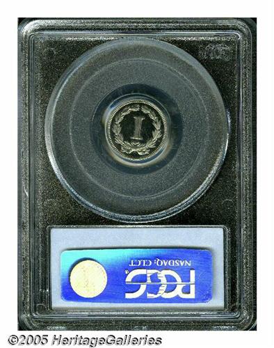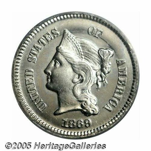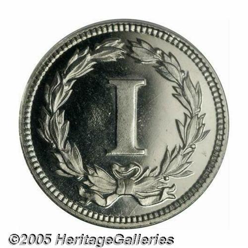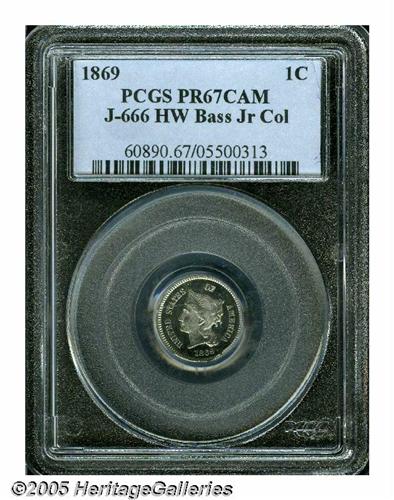 <B>1869<1C> One Cent, Judd-666, Pollock-741, 742, 743, R.5, PR67 Cameo PCGS.</B></I> Ex: Harry W. Bass, Jr. Collection. The obverse exhibits a bust of Liberty facing left with the legend UNITED STATES OF AMERICA around the periphery and the date below the bust. Liberty wears a coronet inscribed LIBERTY. A Roman numeral I is centered in a laurel wreath on the reverse. Struck in nickel with a plain edge. Both sides of this dazzling Superb Gem are notable for their deep, watery reflectivity and peerless surface quality.<BR><I>From The Western Hills Collection.</B></I>