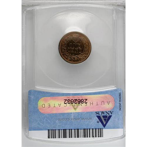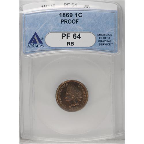 <B>1869<1C> PR64 Red and Brown ANACS.</B></I> Deep reddish-brown and cobalt-blue toning adorns both sides. Sharply struck, as expected for a proof, with non-reflective fields and contact-free surfaces overall.