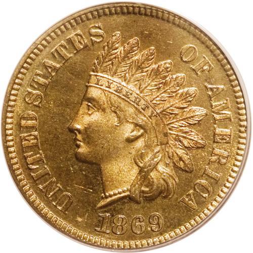 <B>1869 1C PR66 Red and Brown PCGS.</B></I> A robustly struck and scintillating example, lemon-gold at the periphery and pumpkin-brown in the centers. Aside from minor carbon and a single contact mark on Liberty's cheekbone, the surfaces are extraordinarily well-preserved. This piece is tied for the finest Red and Brown proof certified by either NGC or PCGS (12/06).<BR><BR><b>Shipping:</b> Coin/Currency (<a target="_blank" href="http://www.heritageauctions.com/common/shipping.php">view shipping information</a>)