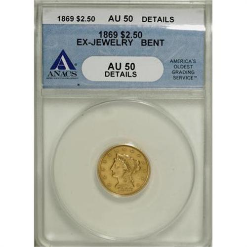<B>1869 $2 1/2 --Bent, Ex-Jewelry--ANACS. AU50 Details.</B></I> NGC Census: (6/90). PCGS Population (13/52). Mintage: 4,300. Numismedia Wsl. Price for NGC/PCGS coin in AU50: $600. (#7809)<BR><BR><B>Coin Engraver:</B> Christian Gobrecht<BR><BR><b>Shipping:</b> Coins & Currency (<a target="_blank" href="http://www.heritageauctions.com/common/shipping.php">view shipping information</a>)