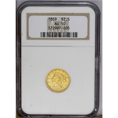 <B>1869<$2 1/2> AU50 NGC.</B></I> Well preserved for the issue with uniform orange-gold surfaces that show no singularly distracting marks.<BR><I>From The Steve Glenn Collection.</B></I> <BR><BR><B>Important notice:</B> Heritage usually auctions material at the rate of 200-250 lots per hour. On some occasions eBay Live bid software or the Internet may not be able to keep up with the pace of the auction. We recommend placing a realistic absentee bid now as insurance to avoid disappointment. Occasionally the auctioneer may eliminate or reject an eBay Live bid, and the auctioneer may also reopen a lot after the close of the eBay live bidding (usually because we missed an audience bid), and may reject your bid even if it shows you as the winning bidder. By bidding via eBay Live, you agree that Heritage may award the lot to another bidder at its sole discretion under the circumstances described above or any other reasonable circumstances. Since eBay bids are not shown to us until we open the lot on the floor, we treat those bids just like floor bids. In most cases the floor responds before the eBay bid is presented to us, due to Internet lag time, so for consistency we have made it a policy that floor bids are always considered first over tie eBay live bids. Also please note that all Heritage lots purchased through eBay Live carry a 20% Buyer's Premium. Please make sure you read the Terms and Conditions before you bid. This lot is being auctioned in conjunction with a live floor auction by Heritage Galleries & Auctioneers. All final auction and invoice information will be supplied by Heritage Galleries & Auctioneers, and all other information should be considered preliminary. Lot:2419 <BR><BR><B>Winning Notification and Billing:</B> After the FINAL session in this auction is complete, Heritage will send e-mail and snail mail invoices. This process normally takes several days. All final auction and invoice information will be supplied by Heritage Galleries & Auctioneers, and all other information should be considered preliminary. <BR><BR>This auction will be conducted on a live auction floor and over the Internet through eBay Live. If you choose to place an absentee bid, please take a moment to <font color='#0000ff'><u><a href='http://pages.ebay.com/liveauctions/help/before/laabsentee.html'>learn how eBay Live absentee bidding works</a></u></font><font color='#000000'>