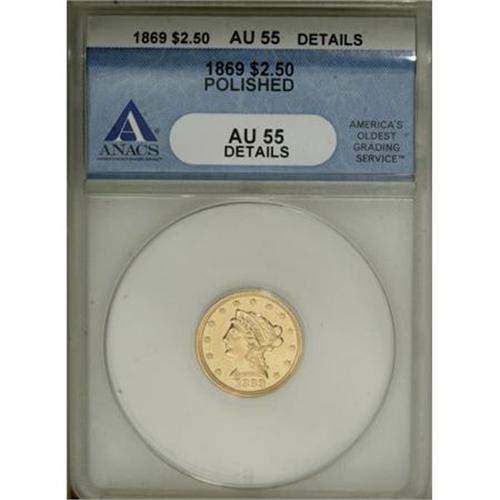 <B>1869 $2 1/2 --Polished--ANACS. AU55 Details.</B></I> NGC Census: (21/62). PCGS Population (19/24). Mintage: 4,300. Numismedia Wsl. Price for NGC/PCGS coin in AU55: $1,000. (#7809)<BR><BR><B>Coin Engraver:</B> Christian Gobrecht<BR><BR><b>Shipping:</b> Coins & Currency (<a target="_blank" href="http://www.heritageauctions.com/common/shipping.php">view shipping information</a>)