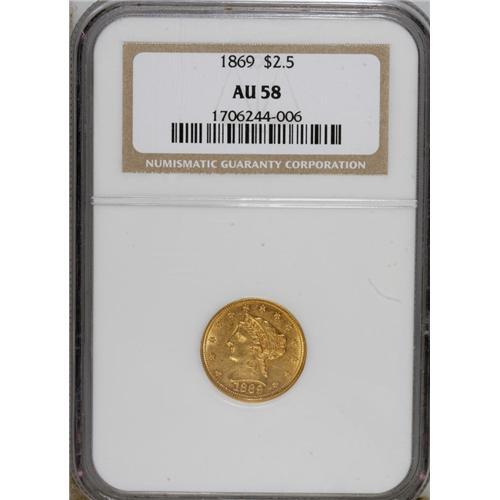 <B>1869 $2 1/2 AU58 NGC.</B></I> Boldly struck and satiny, with a trace of highpoint friction on Liberty's hair detail, few marks, and some extremely faint hairlines in the fields. Census: 41 in 58, 19 finer (3/07).<BR><BR><b>Shipping:</b> Coins & Currency (<a target="_blank" href="http://www.heritageauctions.com/common/shipping.php">view shipping information</a>)