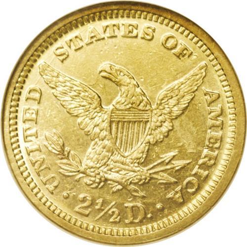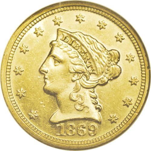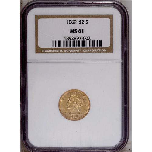 <B>1869<$2 1/2> MS61 NGC.</B></I> A very scarce coin in all grades, Mint State example are very elusive. The original mintage was only a low 4,320 pieces. This coin has bright, semi-reflective fields, is sharply struck in all areas, and shows a few small, scattered abrasions on each side. Subtle reddish color has accumulated over the years. Census: 10 in 61, 4 finer (1/06).