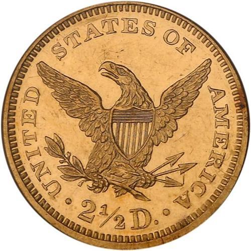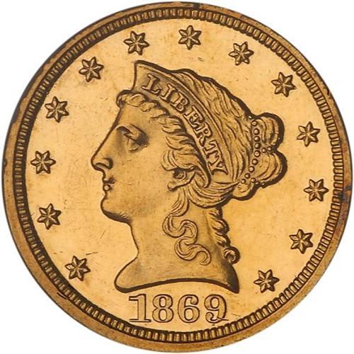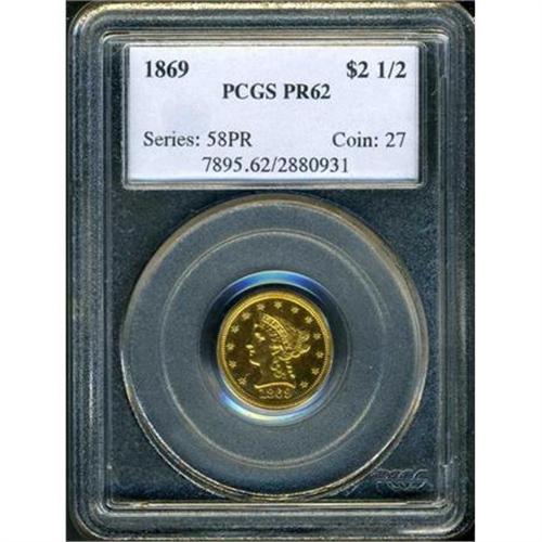 <b>1869 $2.50 Liberty. PCGS graded Proof 62.</b> Pop: 1/9. Part of a minuscule Proof mintage of just 25 coins, this lovely Quarter Eagle is boldly struck with brilliant, deeply reflective mirrored fields. A lengthy, narrow scratch above the bust of Liberty limits the grade of this otherwise eye-catching beauty.