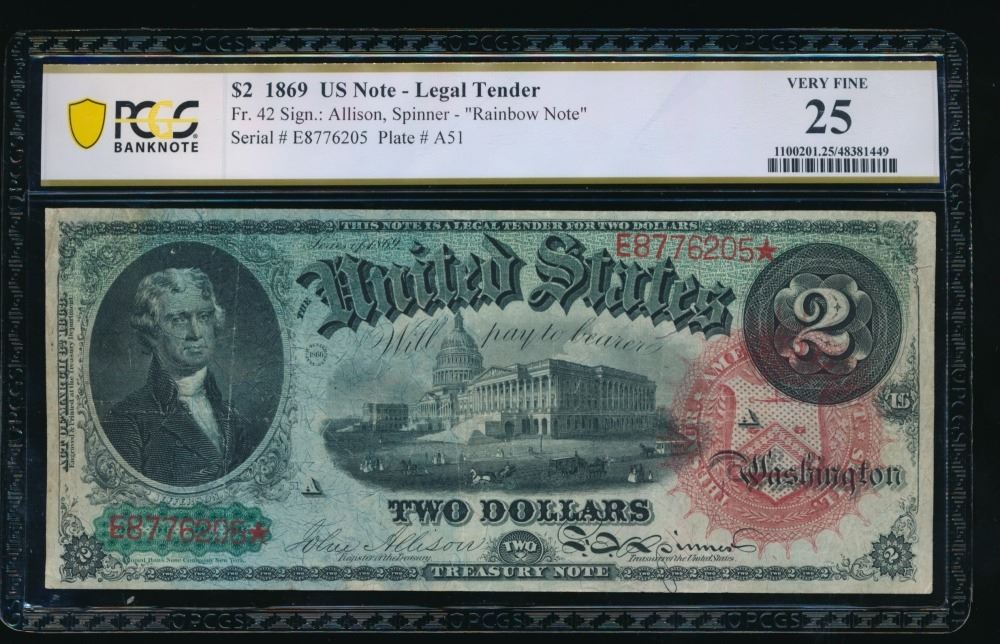 One 1869 $2 Legal Tender Note PCGS 25.