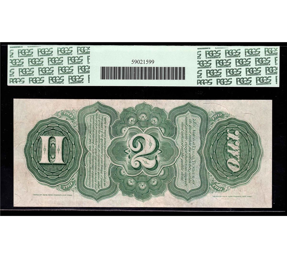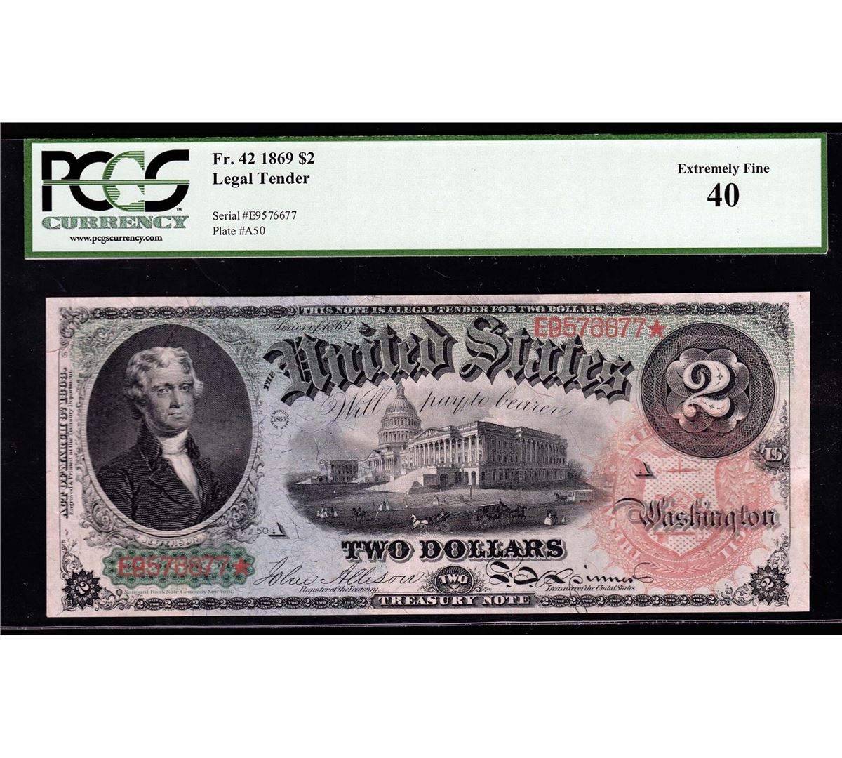One 1869 $2 Legal Tender "Rainbow" Note PCGS Graded XF40. PCGS Graded.