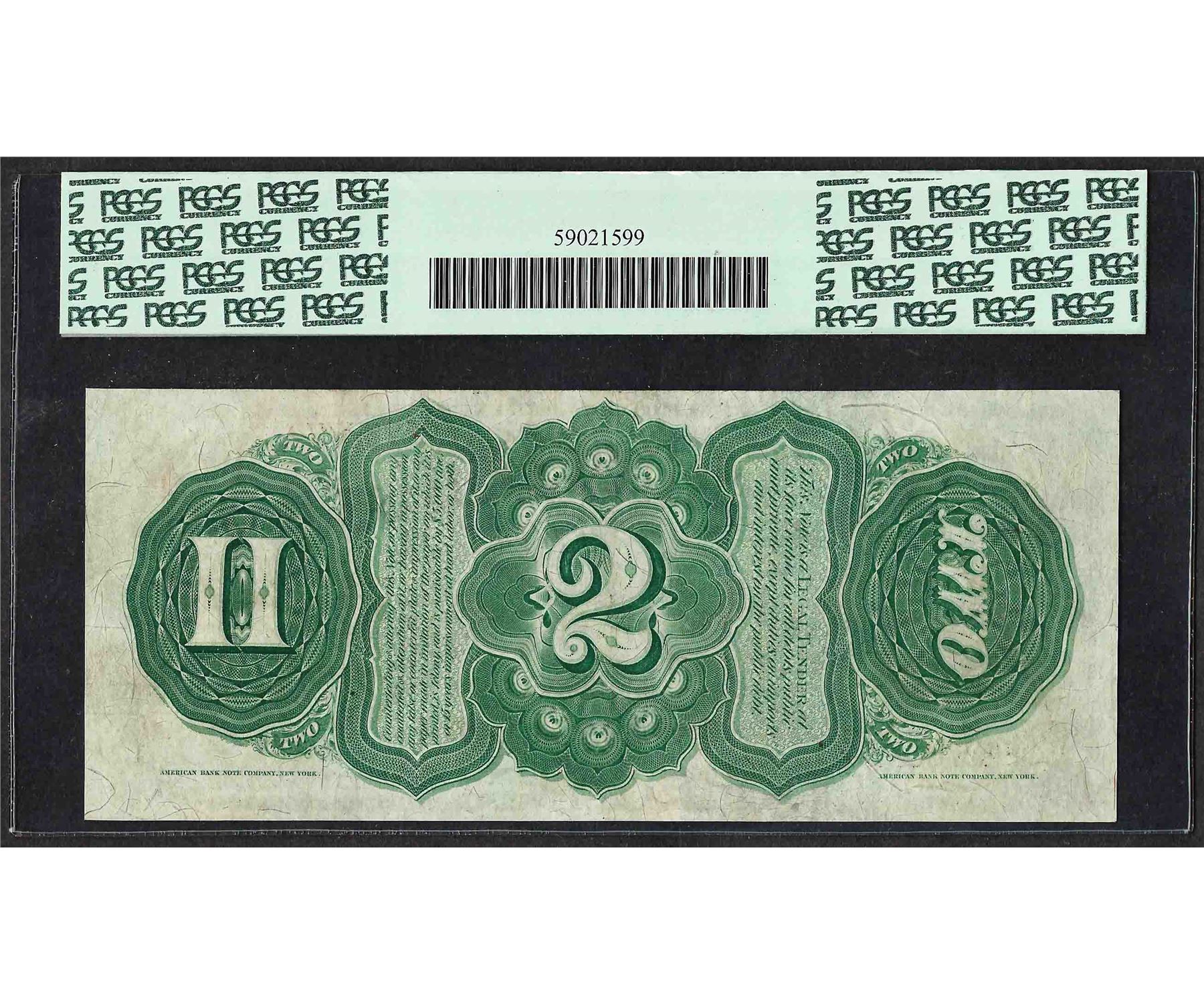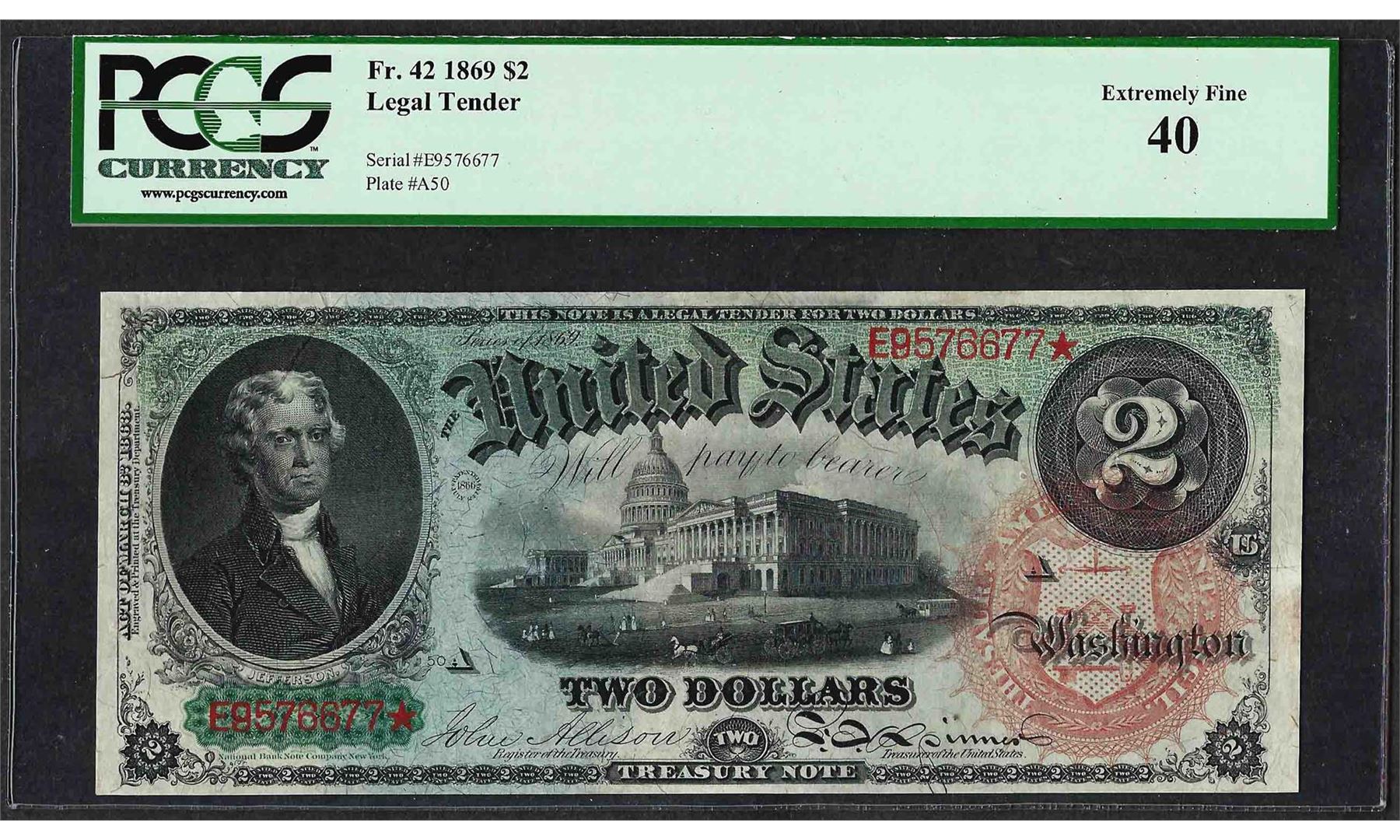 One 1869 $2 Rainbow Legal Tender Note Fr.42 PCGS Extremely Fine 40. PCGS Graded.