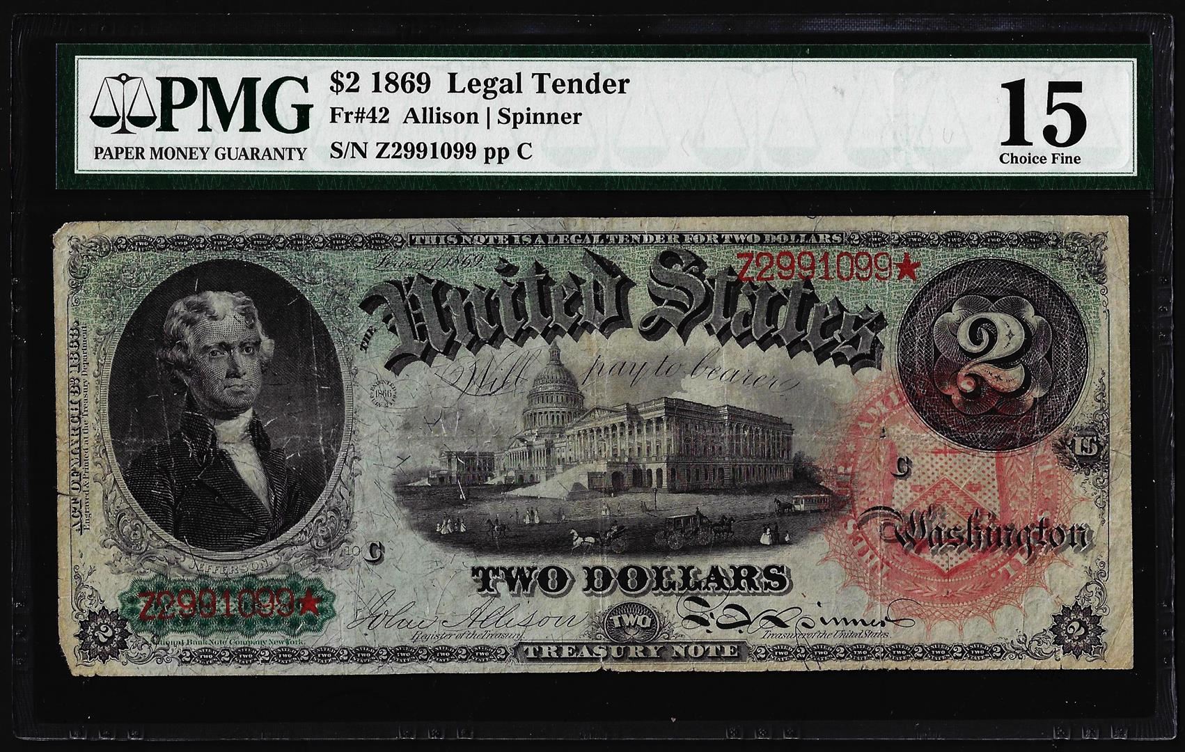 One 1869 $2 Rainbow Legal Tender Note Fr.42 PMG Choice Fine 15. PMG Certified.
