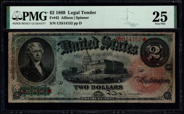 One 1869 $2 Rainbow Legal Tender Note PMG 25.