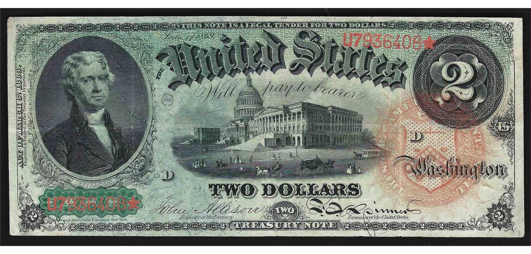 One 1869 $2 Rainbow Legal Tender Note.