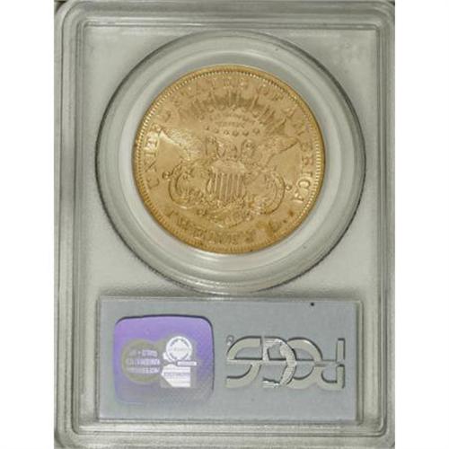 <B>1869 $20 AU53 PCGS.</B></I> This still-shining green-gold P-mint piece shows whispers of orange at the margins. Well struck overall with a touch of rub and light to moderate abrasions on each side. Population: 34 in 53, 65 finer (11/07).<BR><BR><B>Coin Engraver:</B> James B. Longacre<BR><BR><b>Shipping:</b> Coins & Currency (<a target="_blank" href="http://www.heritageauctions.com/common/shipping.php">view shipping information</a>)
