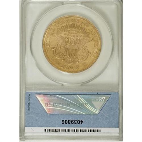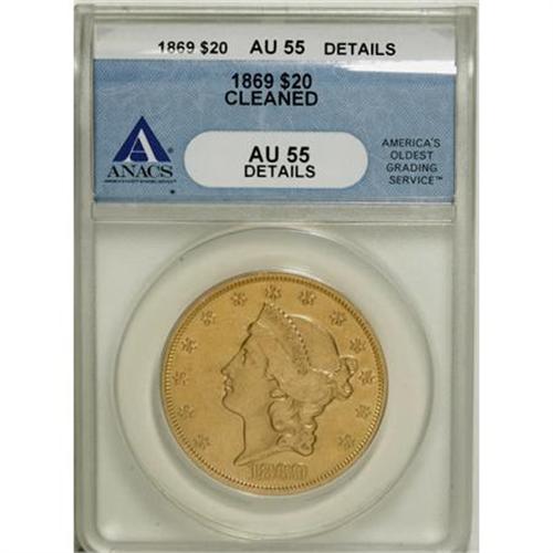 <B>1869 $20 --Cleaned--ANACS. AU55 Details. </B></I> Boldly detailed for the grade and free of noticeable wear, this khaki-gold piece has a rather subdued appearance overall, due to improper cleaning. The coin is well struck with a few minor abrasions noted on each side. <BR><BR><B>Coin Engraver:</B> James B. Longacre<BR><BR><b>Shipping:</b> Coins & Currency (<a target="_blank" href="http://www.heritageauctions.com/common/shipping.php">view shipping information</a>)