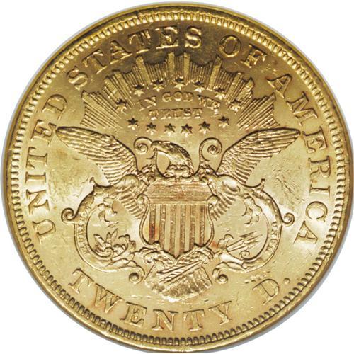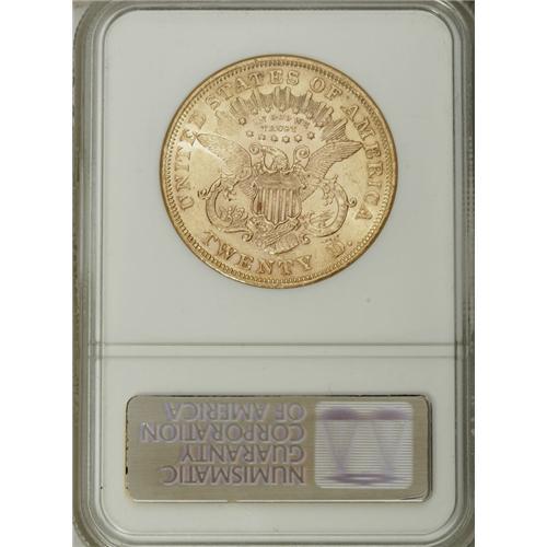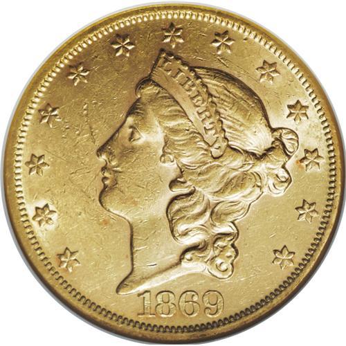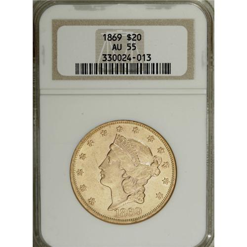1869 $20 AU55 NGC. This is a bright, honey-gold coin,