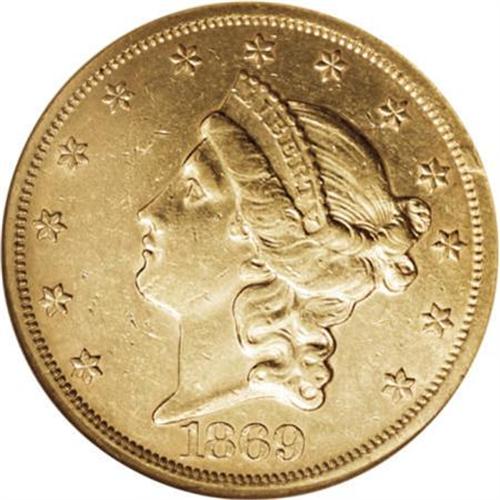 <B>1869 $20 AU55 NGC.</B></I> The deep green-gold color of this Choice AU example is complemented by peach peripheral accents on each side. The coin is well struck and only shows a modest degree of wear on the design's highest points. This issue is considered scarce in AU condition, and it becomes extremely challenging in Mint State. <BR><BR><B>Coin Engraver:</B> James B. Longacre<BR><BR><b>Shipping:</b> Coins & Currency (<a target="_blank" href="http://www.heritageauctions.com/common/shipping.php">view shipping information</a>)