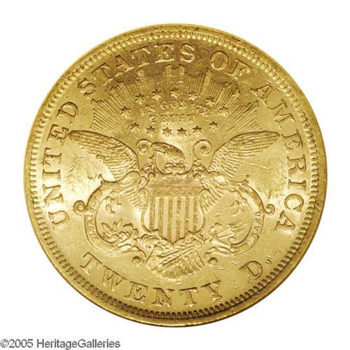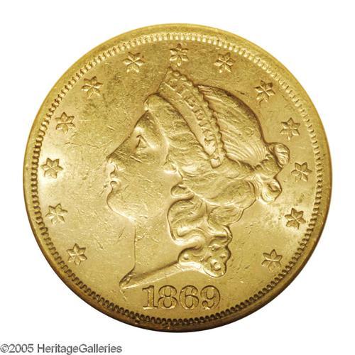 <B>1869<$20> AU58 NGC.</B></I> A conditionally elusive Type Two issue from the Philadelphia mint, with high-end XFs being the average grade found. This near-Mint State specimen displays a strong strike and ample luster on both sides, but particularly on the reverse where it is virtually complete.<BR><I>From The Meads Point Collection.</B></I>