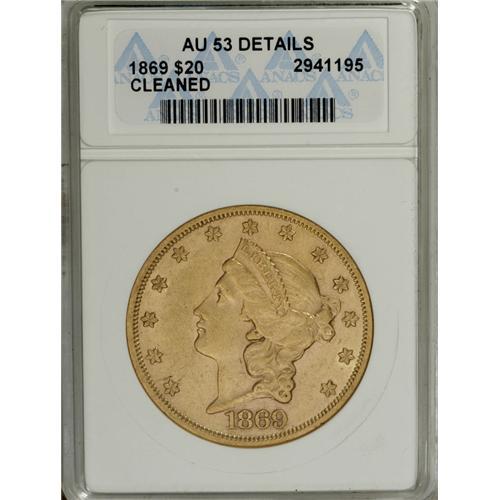 1869 $20 --Cleaned--ANACS. AU53 Details. A subdued oliv