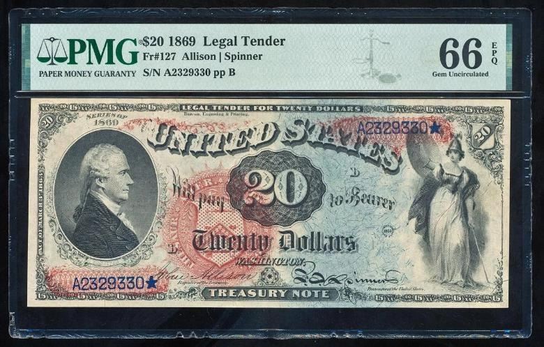 One 1869 $20 Rainbow Legal Tender Note PMG 66EPQ.