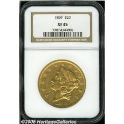 <B>1869 $20 XF45 NGC.</B></I> Luster radiates from the individual stars and the recessed areas of the portrait. A better date, since by 1869 the San Francisco Mint had assumed the majority of Double Eagle production.